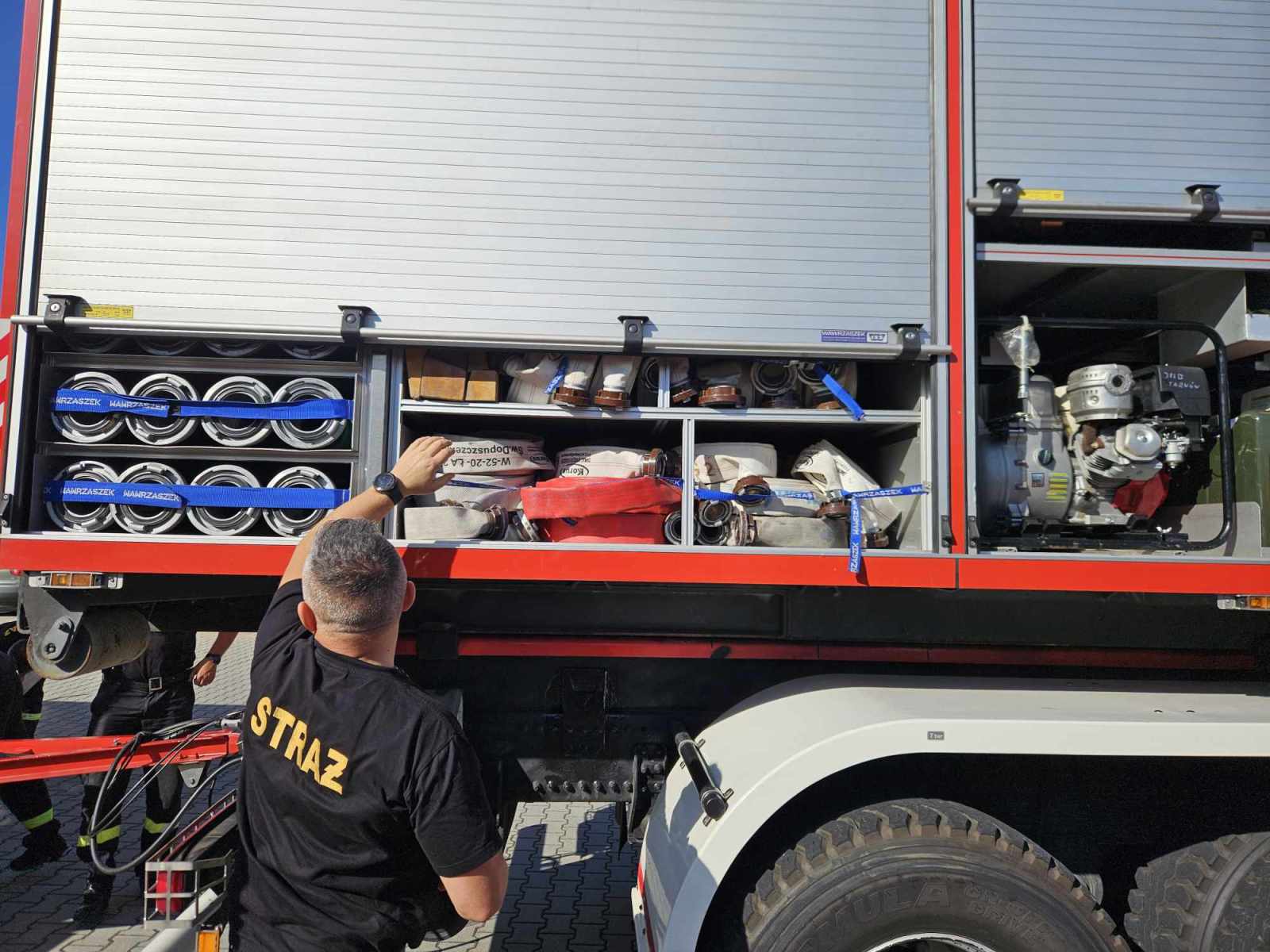 – Na kontenerze mamy 18 pomp szlamowych, przenośnych. Dodatkowo pompy elektryczne, agregaty prądotwórcze, nagrzewnice. Ten kontener budowlany też jest można powiedzieć taką nowością, która weszła do użytkowania w straży. Służy do wszelkich prac wsparcia, tak jak teraz będzie trzeba poprzewozić różne elementy. Kontener metalowy też nie boi się żadnych elementów, służy podobnie jak kontener budowlany do przewożenia. Dodatkowo mamy quad, który będzie służył w trudnym terenie