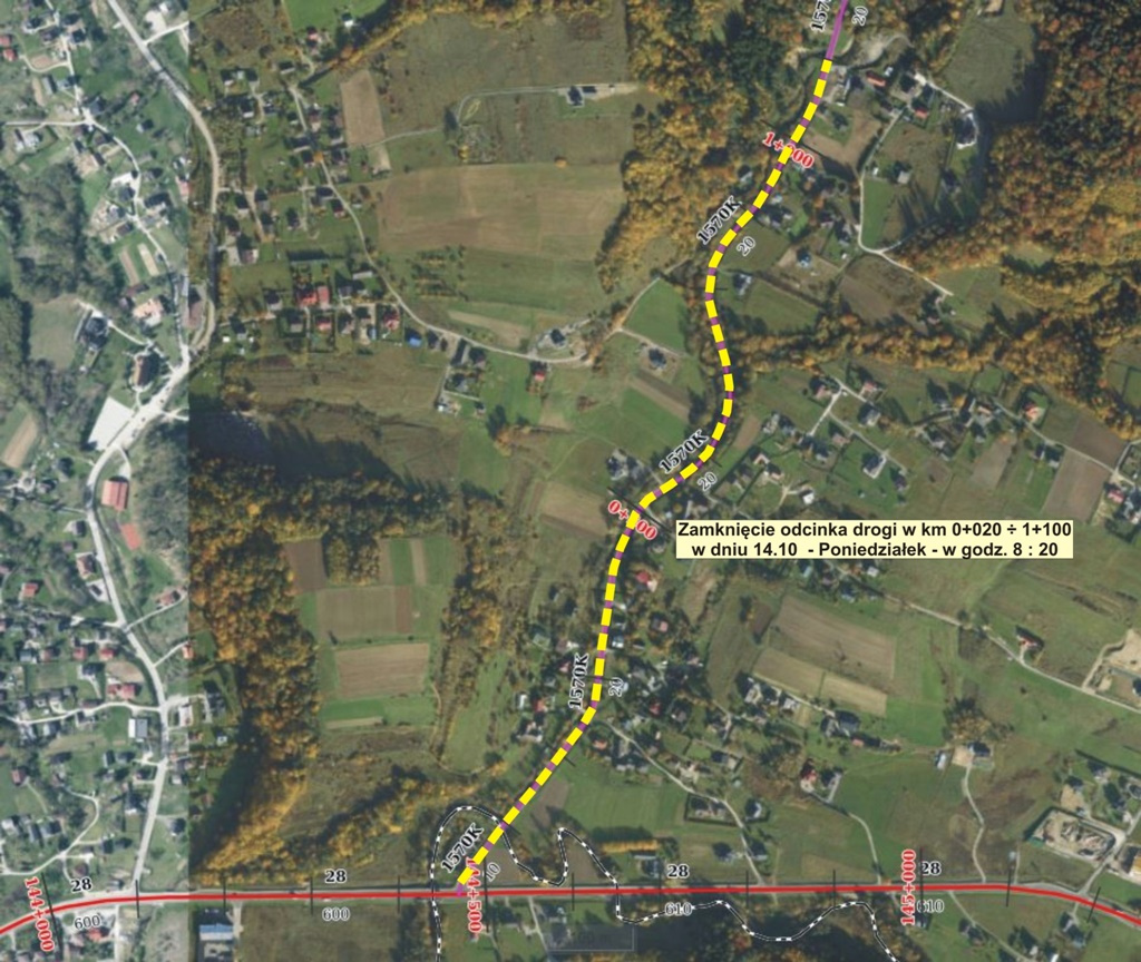 14.10.2024 r. – PONIEDZIAŁEK – na odcinku w km 0+020 ÷ 1+100 od skrzyżowania z DK nr 28 do nowobudowanego mostu przy tartaku.