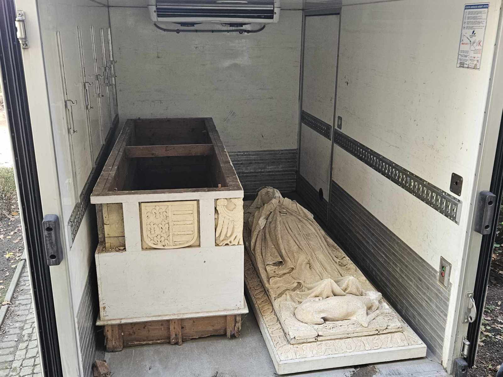-Przywieźliśmy po części odrestaurowany, można powiedzieć właściwie ogarnięty tylko z grubsza, pierwowzór sarkofagu Królowej Jadwigi. Tego sarkofagu, który znajduje się na Wawelu. Twórcą tego sarkofagu był Antoni Madeyski. Sarkofag posadowiony w 1902 roku w listopadzie, a ten przywędrował tutaj z Włoch do Polski, do nas. Jak państwo zobaczycie u góry u wezgłowia jest Rzym 1901, a więc musiał być wykonany w Rzymie w 1901 roku. Okazuje się, że mamy model 1 do 1, w takiej samej wielkości znajduje się ten model na Wawelu.