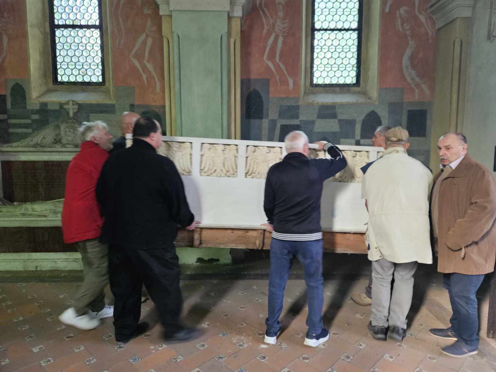 -Przywieźliśmy po części odrestaurowany, można powiedzieć właściwie ogarnięty tylko z grubsza, pierwowzór sarkofagu Królowej Jadwigi. Tego sarkofagu, który znajduje się na Wawelu. Twórcą tego sarkofagu był Antoni Madeyski. Sarkofag posadowiony w 1902 roku w listopadzie, a ten przywędrował tutaj z Włoch do Polski, do nas. Jak państwo zobaczycie u góry u wezgłowia jest Rzym 1901, a więc musiał być wykonany w Rzymie w 1901 roku. Okazuje się, że mamy model 1 do 1, w takiej samej wielkości znajduje się ten model na Wawelu.
