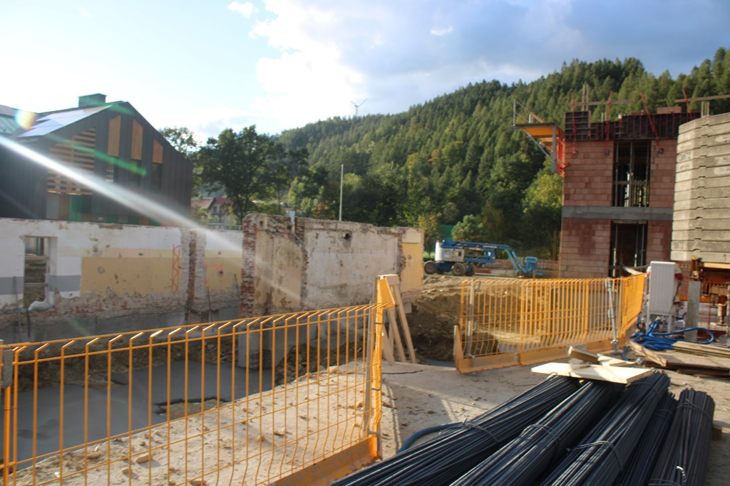 Trwa rozbudowa nowej szkoły w Rytrze. Prace mają zakończyć się w 2026 roku. Na placu budowy działają koparki i żurawie. Budynek starej placówki został w ostatnich miesiącach częściowo zburzony, a dzieci od września uczą się w budynku po gimnazjum.