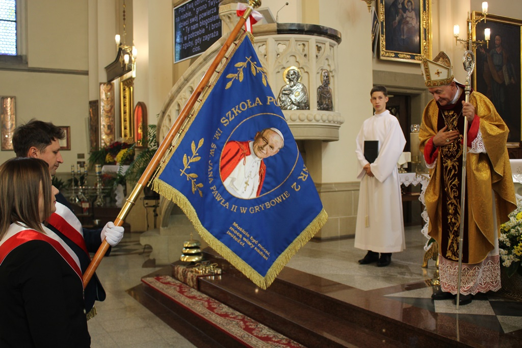 Teraz tej domowej atmosferze będzie towarzyszył św. Jan Paweł II, patron szkoły widnieje na jej sztandarze, poświęconym podczas uroczystej Mszy Świętej sprawowanej przez biskupa Andrzeja Jeża w grybowskiej bazylice.