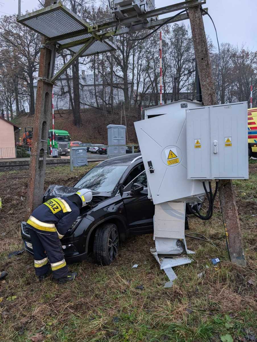 Kobieta kierująca samochodem zjechała z jezdni i uderzyła w słup znajdujący się przy drodze. Na miejsce przyjechały zastępy strażackie, policja, pogotowie ratunkowe i pogotowie energetycnze.
