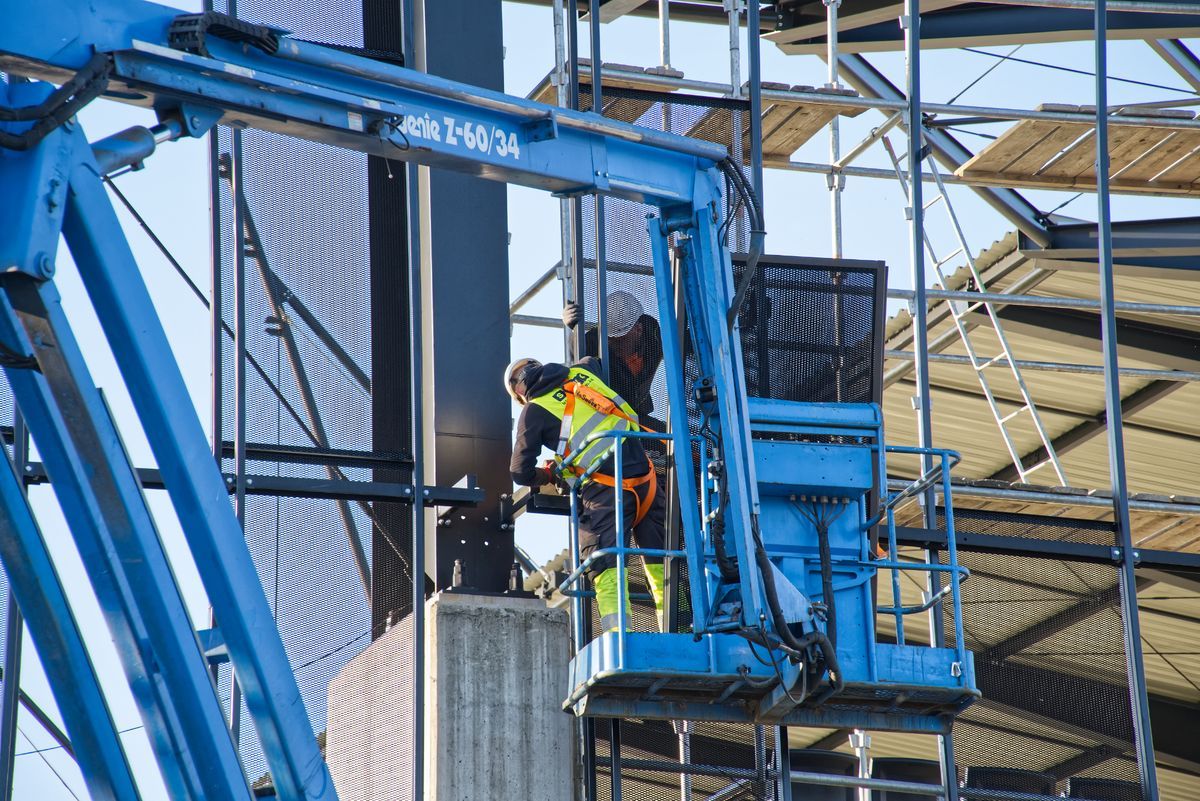 Montaż stalowej siatki cięto-ciągnionej został już zrealizowany na trybunach C i D, a kolejnym etapem będzie instalacja elementów elewacji na trybunie B.