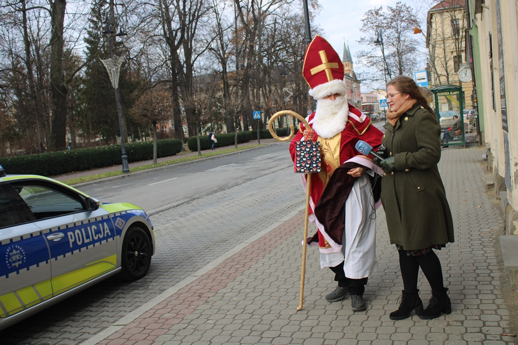 Mikołaj zatrzymywał samochody, ale też pieszych. Razem z policjantami z Komendy Miejskiej Policji w Nowym Sączu przypominał o tym, że najlepszy prezent na święta to nasze bezpieczeństwo.
