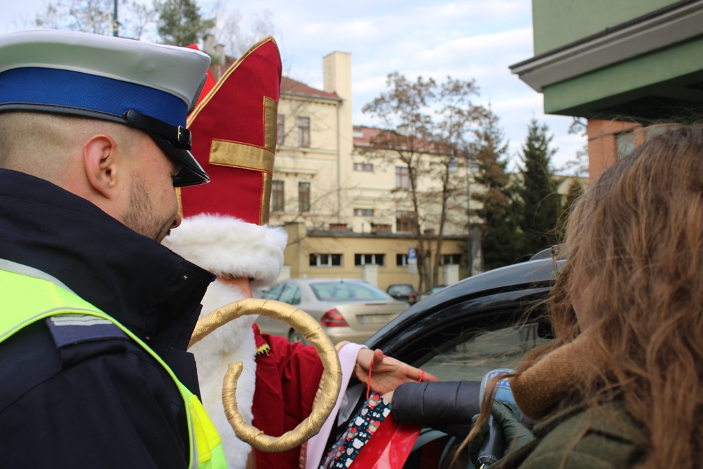 Mikołaj zatrzymywał samochody, ale też pieszych. Razem z policjantami z Komendy Miejskiej Policji w Nowym Sączu przypominał o tym, że najlepszy prezent na święta to nasze bezpieczeństwo.