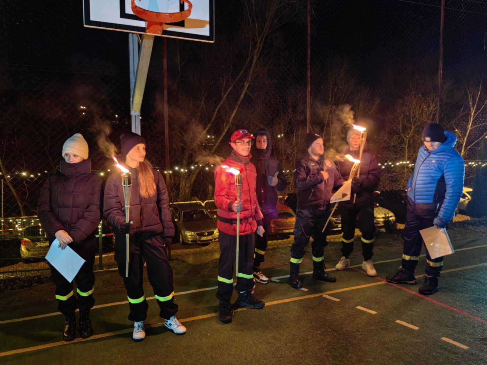 Wszyscy uczestnicy zostali podzieleni na grupy i wraz z wychowawcami oraz mapą w ręce ruszyli na poszukiwanie. Uczniowie ubrani w odblaskowe stroje przy okazji propagowali bezpieczne poruszanie się późną porą. Zgodnie z wyznaczoną trasą realizowali przygotowane zadania, a po ich wykonaniu wszyscy wrócili do szkoły na gorący posiłek. Następnie w dwóch grupach młodszych i starszych dzieci oglądali filmy świąteczne, aż do momentu, gdy rozległ się dźwięk syreny strażackiej i wszyscy z ciekawością wybiegli na podwórko szkolne. A tam na niebie rozbłysły fajerwerki i na plac szkolny wjechał samochód strażacki, a w nim… poszukiwany św. Mikołaj, który w asyście dzieci przeszedł do budynku szkoły, w którym powitano go piosenkami.