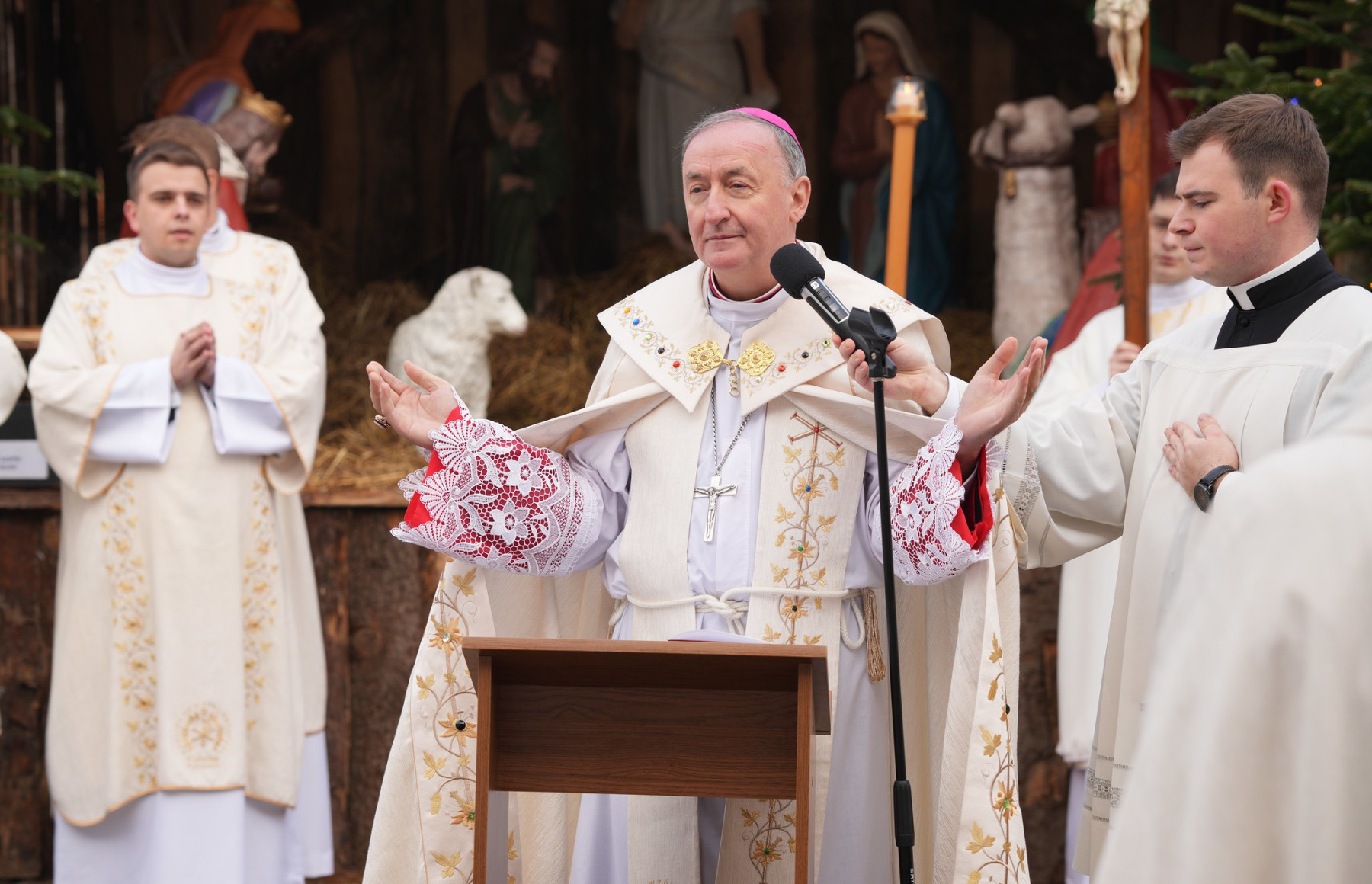 W uroczystości licznie uczestniczyli duchowni z całej diecezji, siostry zakonne, alumni i świeccy. Na początku odmówiono modlitwę przy szopce obok bazyliki, przeczytano Ewangelię i fragmenty zaczerpnięte z bulli ogłaszającej Jubileusz. Następnie uczestnicy przeszli w procesji do katedry. Przez główne drzwi biskup wniósł krzyż i udał się do chrzcielnicy, gdzie przewodniczył obrzędowi pokropienia wiernych i duchownych.