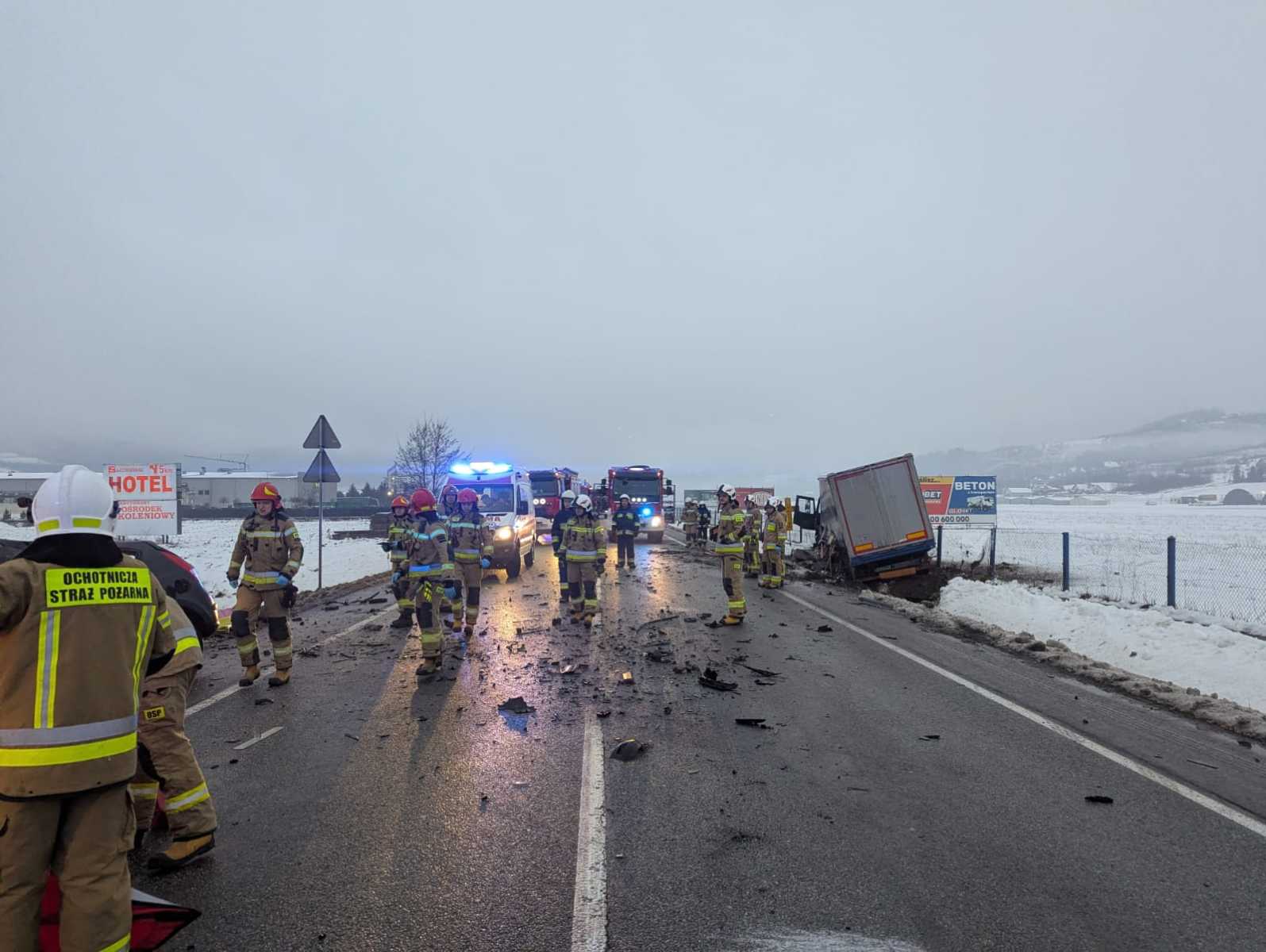 Na miejscu działają służby. Droga jest zablokowana i tworzą się korki w obu kierunkach, również na drodze od strony Michalczowej. Wyznaczono jednak objazd drogą gminną naokoło lotniska.
