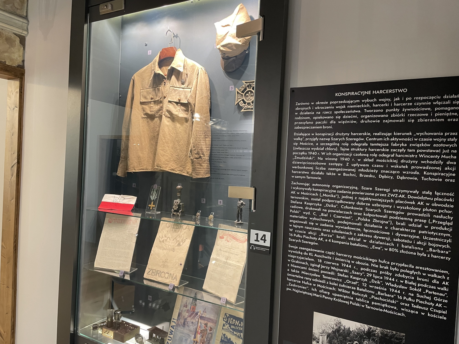 – Gablota poświęcona jest armii niemieckiej, z daleka widzimy hitlerowskie hełmy, tzw. stahlhelmy z kalkomaniami, symboliką wojsk Wermachtu, wojsk piechoty, jednocześnie mamy tutaj szereg obiektów, które dotykają smutnego tematu okupacji, np. dosyć niepozorny podłużny przedmiot przypominający patyk to tzw. bykowiec, czyli pałka wykonana ze skóry byka służąca do katowania ludzi, straszliwy element hitlerowskiego terroru, widzimy dokumenty, symbolikę nazistowską