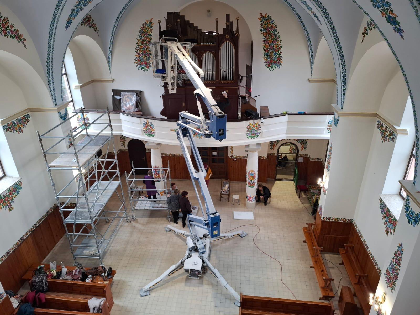 – W ramach renowacji polichromii w kościele parafialnym pw. św. Józefa w Zalipiu zostały wykonane, wymalowane dodatkowe malunki na prośbę księdza proboszcza, zostały umieszczone na suficie i w prezbiterium. Stan techniczny filarów, które wcześniej były pomalowane, też wymagał odnowienia, więc również malarki odtworzyły malaturę, która była na nich umieszczona wcześniej. My z koleżanką malowałyśmy na suficie, inne panie z domu malarek oraz malarki zaprzyjaźnione, które też wcześniej tutaj pracowały z nami, ozdabiały właśnie filary i elementy kościoła.