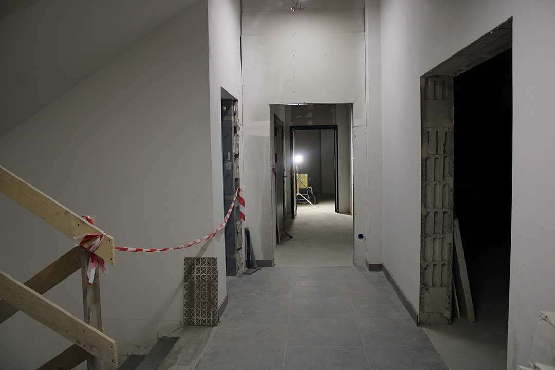Prace trwają też wewnątrz, a chodzi między innymi o układanie płytek i posadzek w łazienkach. Dokończone zostało też zadaszenie trybun.