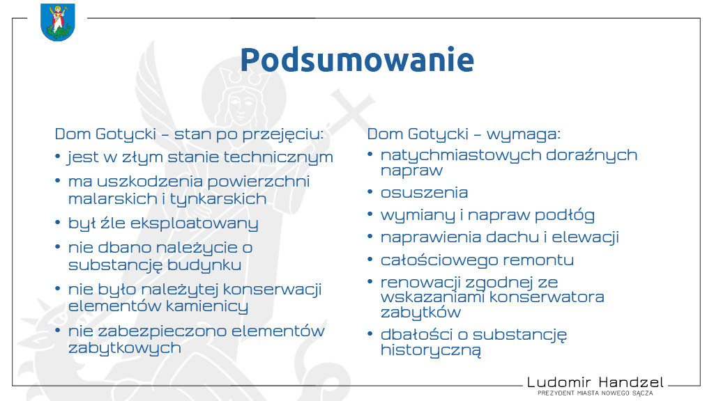 Burza o zabytkowy Dom Gotycki w Nowym Sączu, którego właścicielem jest parafia św. Małgorzaty w Nowym Sączu. Prezydent miasta Ludomir Handzel zarzucił poprzedniemu najemcy czyli Muzeum Ziemi Sądeckiej, że budynek był w fatalnym stanie.