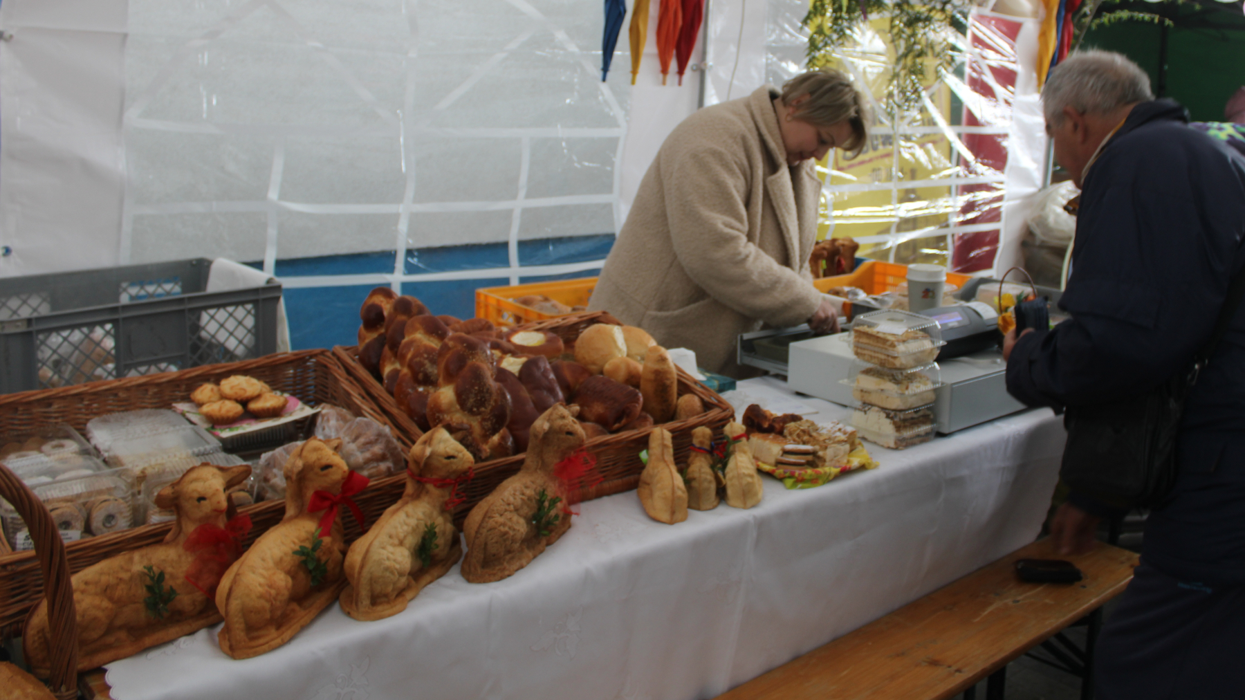 – Rozglądam się za wszystkim. Tak sobie po prostu przyszłam pooglądać, a jak coś mi wpadnie w oko, to sobie kupię. – Ja się za wędliną rozglądam. – Taki żonkilek i jajeczko wzięłam do koszyczka. – Mamy takie ciasteczka, serniczek, migdałowe i orzechowe. I jeszcze białą kiełbasę.