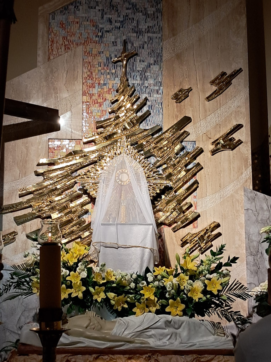 – Zasadniczym miejscem każdego Grobu Pańskiego jest tron, w którym wystawiony jest Najświętszy Sakrament, bo przede wszystkim grób ma być miejscem adoracji Ciała Jezusa Chrystusa. Drugim takim elementem kompozycyjnym to jest oczywiście tabernakulum, czyli miejsce, gdzie jest przechowywany Najświętszy Sakrament, kapłan przenosi Ciało Jezusa do Grobu Pańskiego. Trzecim takim ważnym elementem Grobu Pańskiego jest figura Chrystusa, która zawsze z wielkim szacunkiem jest eksponowana w otoczeniu kwiatów. Kolejnym ważnym miejscem jest pusty krzyż, na którym jest przewieszony całun albo stuła, jako symbol miejsca kaźni –