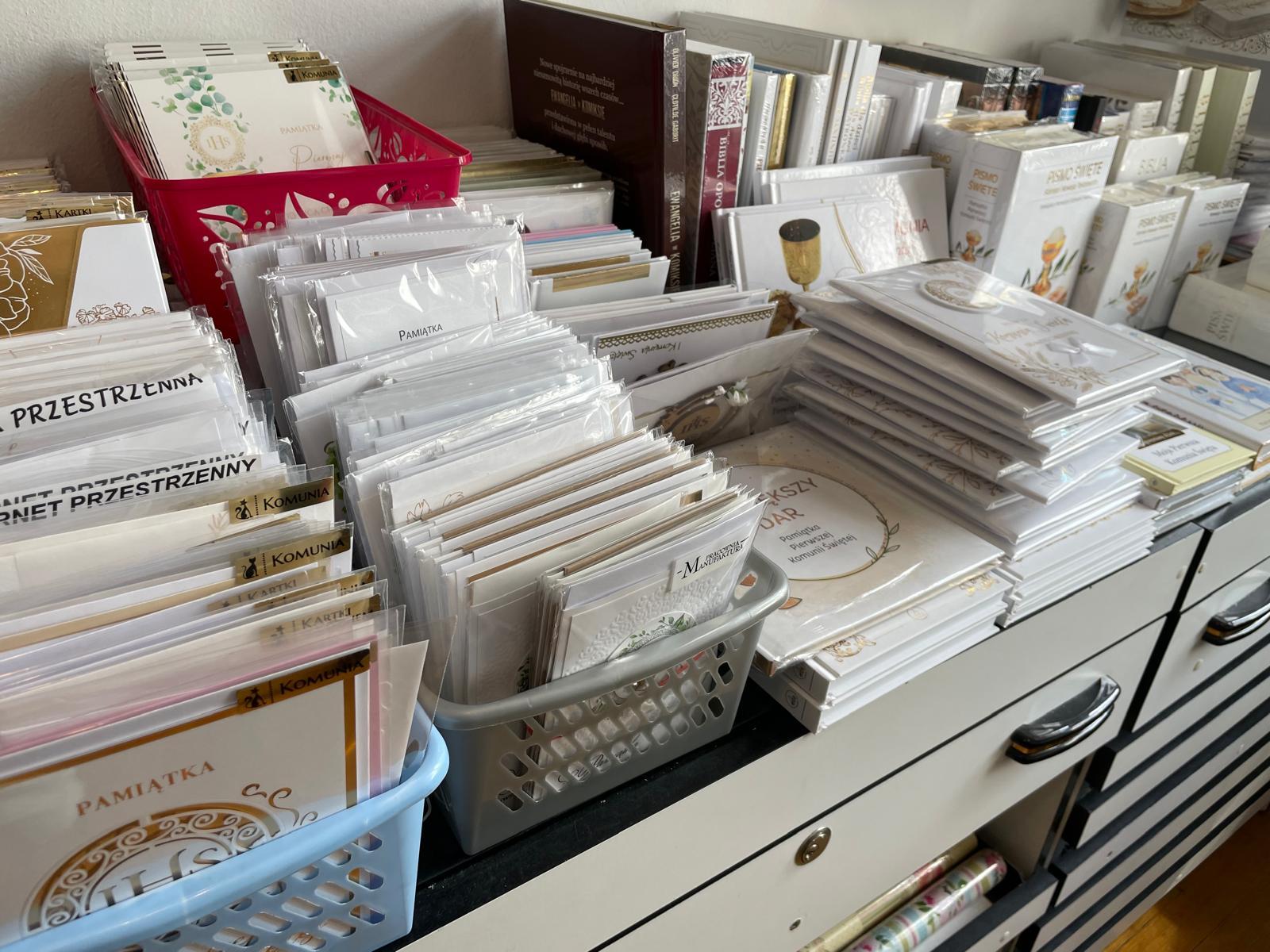 – Karteczki z życzeniami, drukowane, ręcznie robione, pełny wybór, różnej wielkości, od najmniejszej do największych, później są trochę grubsze, gdzie są życzenia, różne myśli, poprzez przekrój w jeszcze większym rozmiarze na tej samej zasadzie, jakieś życzenia i dużo elementów dekoracyjnych i religijnych treści. Pełny asortyment Biblii, różne wydawnictwa, w różnych wielkościach, są też w komiksie. Są również pudełeczka, które mają emblemat eucharystyczny a w środku są życzenia. Tu jest pełna różnorodność, dowolność, klient sam nie wie czasem, co wybrać, są też takie mniejsze gadżety, które stanowią dla rodziców dzieci pierwszokomunijnych podziękowania dla gości, np. aniołek, mały emblemacik, do którego można dołączyć jeszcze podziękowania.
