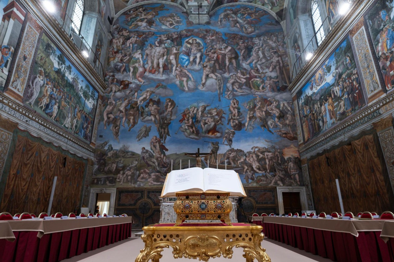 Przed ołtarzem, pod Sądem Ostatecznym, ustawiono stół na drewnianą urnę, do której zbierane będą karty do głosowania, oraz mównicę z Ewangelią, na której kardynałowie złożą przysięgę.