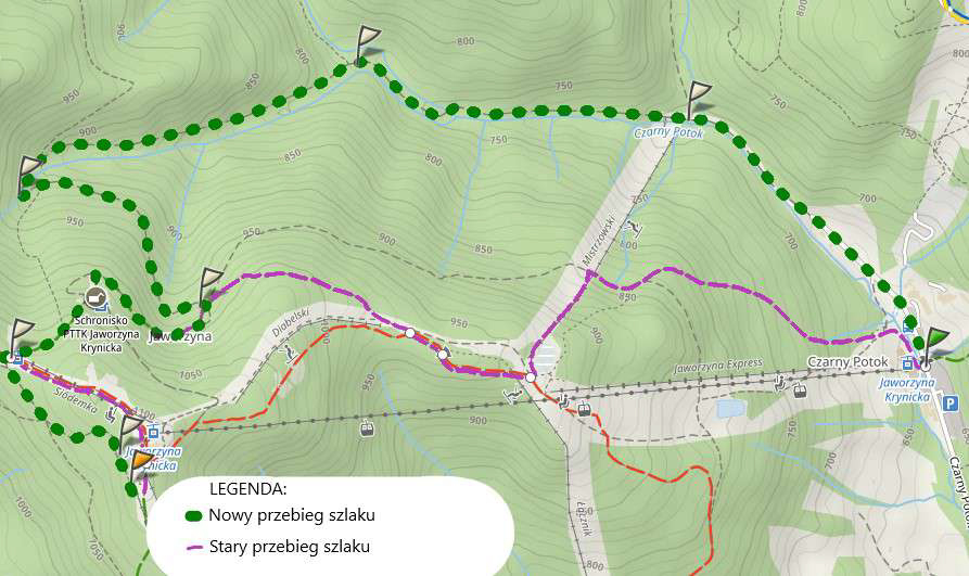 Informację przekazał krynicki oddział Polskiego Towarzystwa Turystyczno-Krajoznawczego oraz Grupa Krynicka GOPR. Jeden z najbardziej znanych szlaków na Jaworzynę nie będzie już biegł obok słynnego Diabelskiego Kamienia i wzdłuż nartostrady. Teraz trasa została wyznaczona drogą gospodarczą do schroniska, biegnącą doliną Czarnego Potoku.