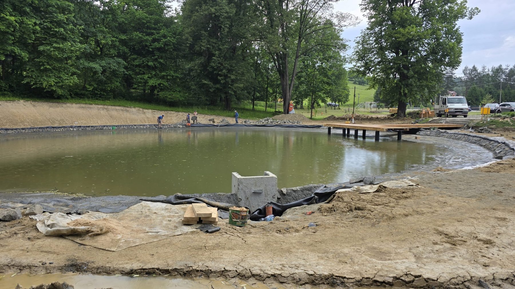 Niecka zbiornika, który powstawał w ostatnich miesiącach, wypełniono już wodą. Gotowy jest też pomost. Teraz pozostało już tylko wyrównanie terenu obok i wysianie trawy.