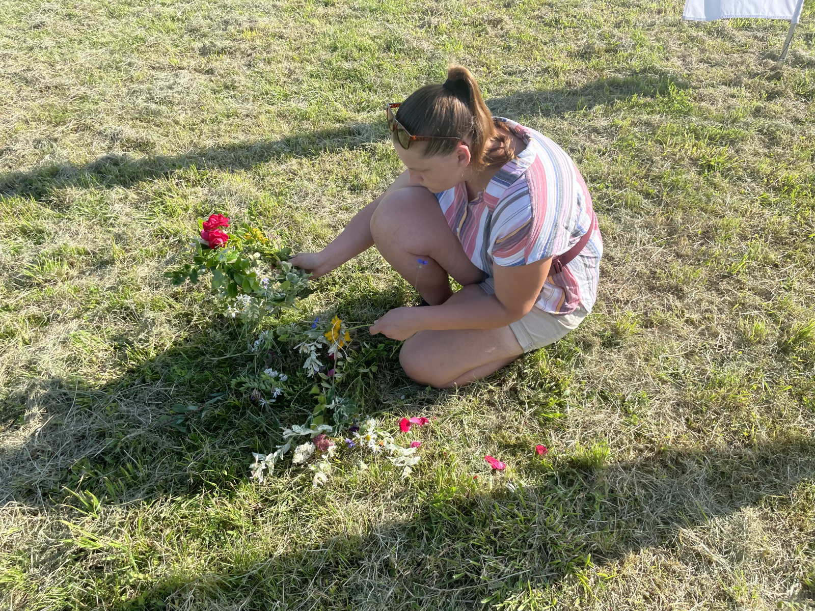 – Trzeba takie koło sobie zrobić, mieć dobry sznurek, żeby to trzymało i takie bukieciki kwiatków układać wkoło, równiutko, powinny być kwiaty polne, ogrodowe, przede wszystkim drobne, żeby wianek wyszedł zgrabny –