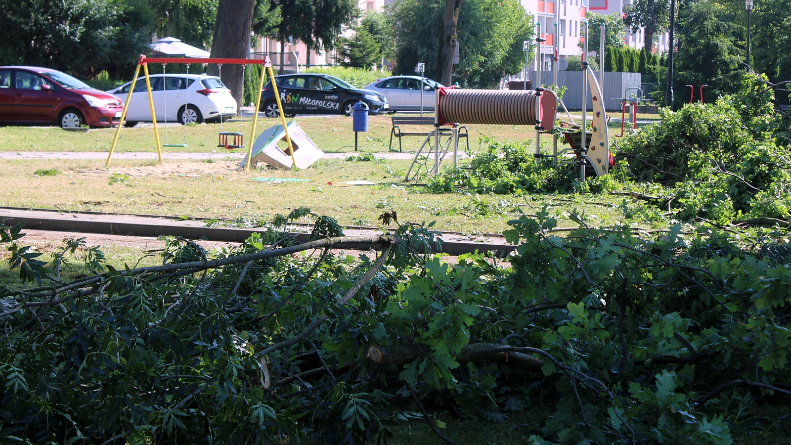 Krajobraz zniszczeń w Niedomicach – zerwany dach, zniszczony plac zabaw, przewrócone drzewa