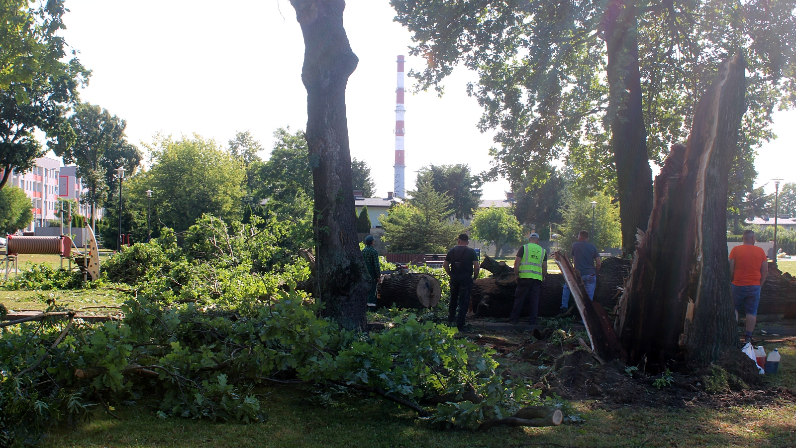 -Szedłem ze sklepu, uciekałem przed deszczem. Wpadłem do tej altany, tutaj, naprzeciwko. Nadeszła taka ulewa, później wszystkie te drzewa się położyły w jedną stronę i nagle było 'bum’, wielki strzał. Wczoraj robotnicy i strażacy robili chyba do północy. Dużą robotę zrobili, Straż Pożarna zaraz była, wszystko uprzątali. Placu zabaw praktycznie już nie ma. Nikomu nic się nie stało, ale tutaj nikogo nie było. Ja byłem chyba najbliżej, bo stałem tutaj. Tylko na osiedlu B, tam jest takie drugie osiedle, tam urwało pół dachu.