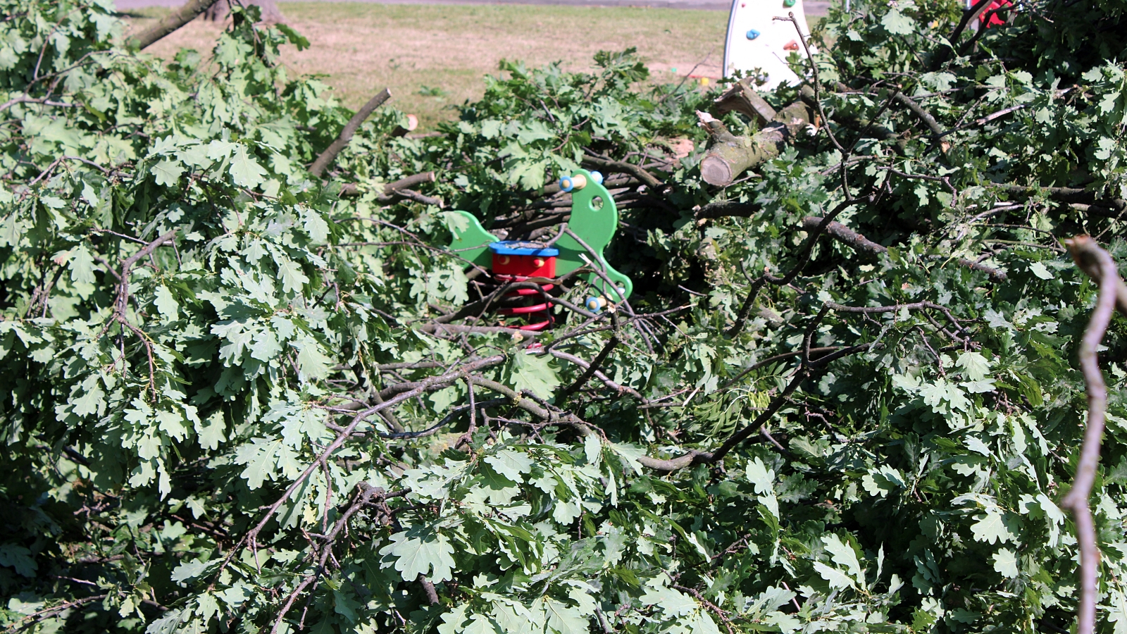 -Szedłem ze sklepu, uciekałem przed deszczem. Wpadłem do tej altany, tutaj, naprzeciwko. Nadeszła taka ulewa, później wszystkie te drzewa się położyły w jedną stronę i nagle było 'bum’, wielki strzał. Wczoraj robotnicy i strażacy robili chyba do północy. Dużą robotę zrobili, Straż Pożarna zaraz była, wszystko uprzątali. Placu zabaw praktycznie już nie ma. Nikomu nic się nie stało, ale tutaj nikogo nie było. Ja byłem chyba najbliżej, bo stałem tutaj. Tylko na osiedlu B, tam jest takie drugie osiedle, tam urwało pół dachu.
