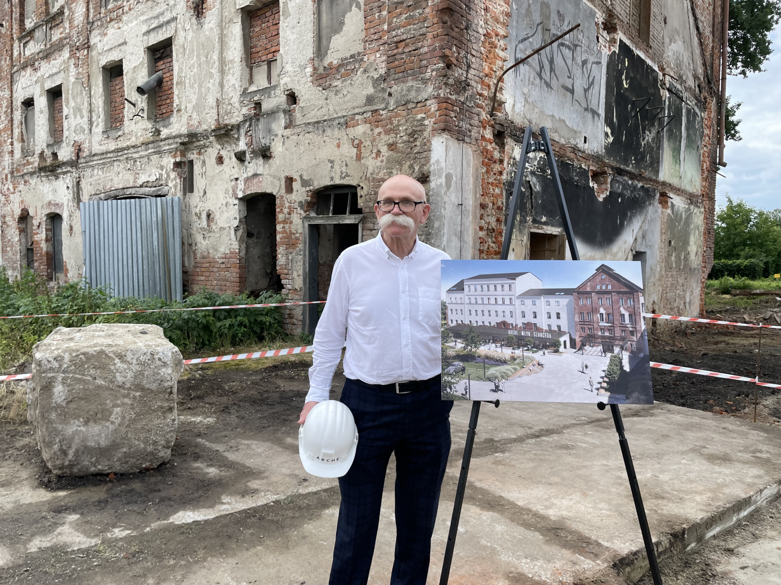 – Ostatni pożar spowodował to, że wszystkie części trzeba ratować i każdy z tych elementów wymaga ręcznych prac zabezpieczających. Tutaj nie da się wjechać dużymi maszynami, natomiast nadamy temu budynkowi też nowe życie, dlatego też obok będziemy realizować rozbudowę już w najbliższych dniach, przyjadą duże maszyny, które będą realizować fundamentowanie w postaci pali. To jest kolejne wyzwanie, bo z jednej strony mamy budynek zabytkowy, który jest w złym stanie technicznym, natomiast z drugiej strony mamy też grunt, który też nie nadaje się w prosty sposób do użytkowania, tylko trzeba go wzmocnić.
