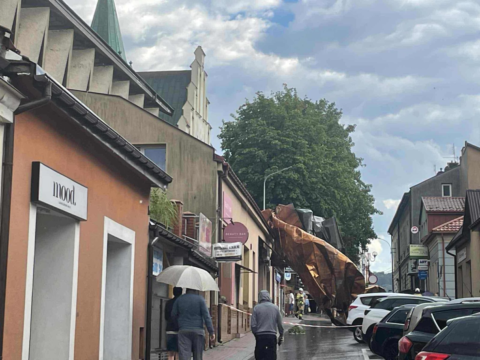 – Strażacy zabezpieczają teren wokół Kościoła św.Jakuba w Brzesku. W wyniku silnego wiatru, doszło do zerwania przykrycia dachu kościoła w trakcie trwa nabożeństwa. Zostało ewakuowanych około 500 osób, nikt nie został poszkodowany.