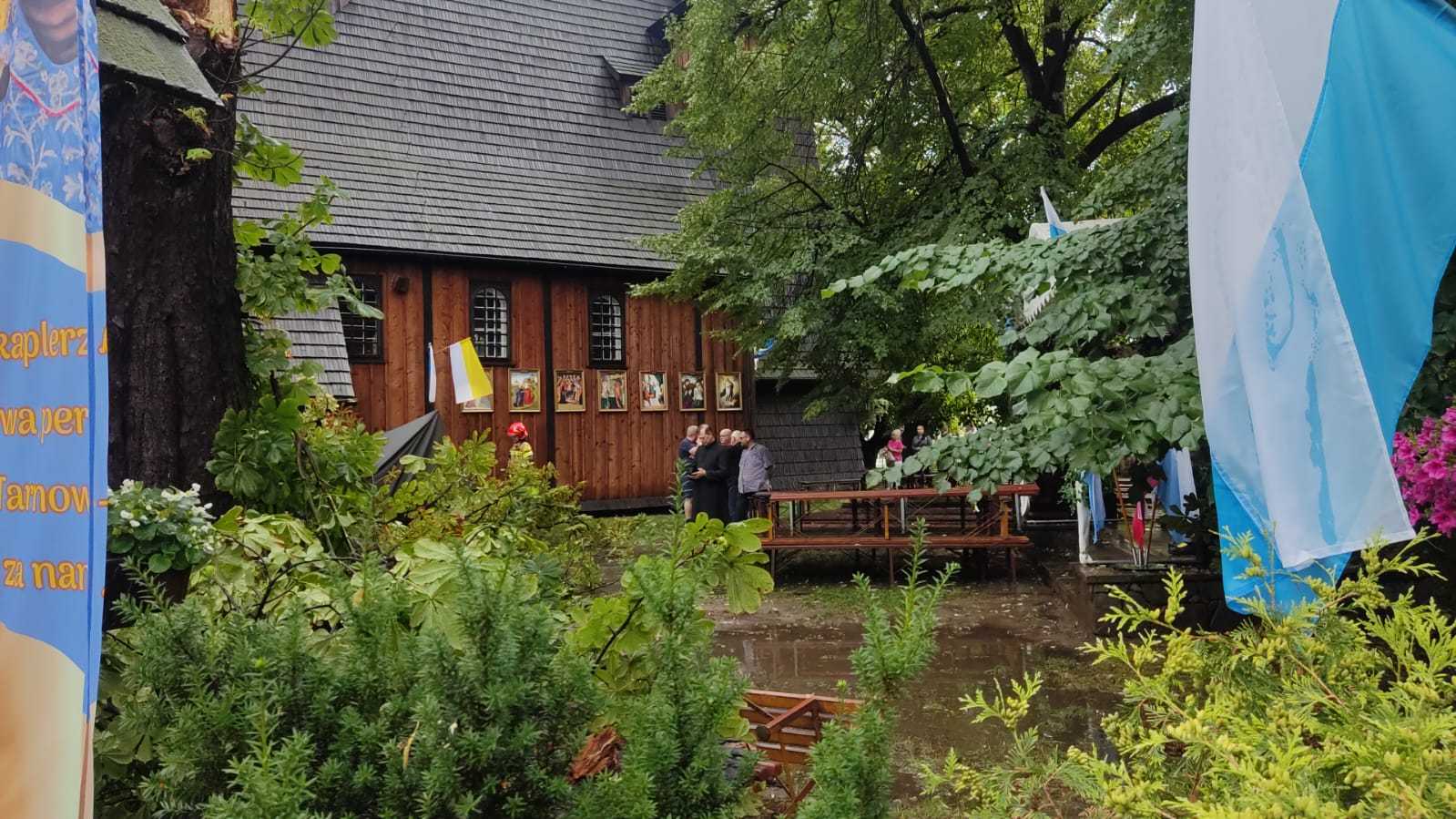 Gwałtowne burze w niedzielne popołudnie przeszły także przez region tarnowski. Tutaj także strażacy interweniowali przy świątyni. Silny wiatr połamał konary drzew przy Sanktuarium Matki Bożej Szkaplerznej w Tarnowie. Gałęzie spadły na ławki otaczające świątynię, na szczęście nikomu nic się nie stało. Nieznacznie został także uszkodzony dach świątyni.