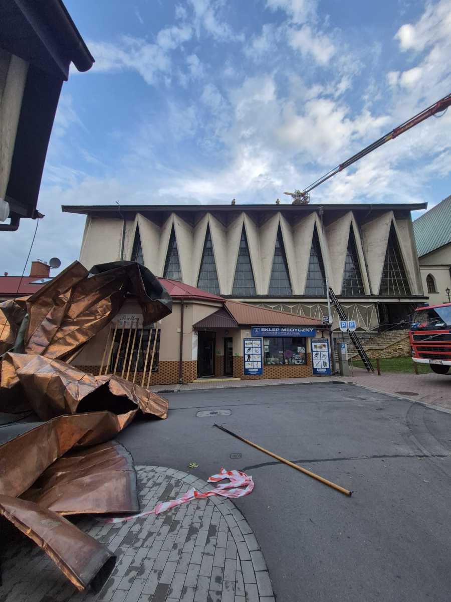 – Strażacy zabezpieczają teren wokół Kościoła św.Jakuba w Brzesku. W wyniku silnego wiatru, doszło do zerwania przykrycia dachu kościoła w trakcie trwa nabożeństwa. Zostało ewakuowanych około 500 osób, nikt nie został poszkodowany.