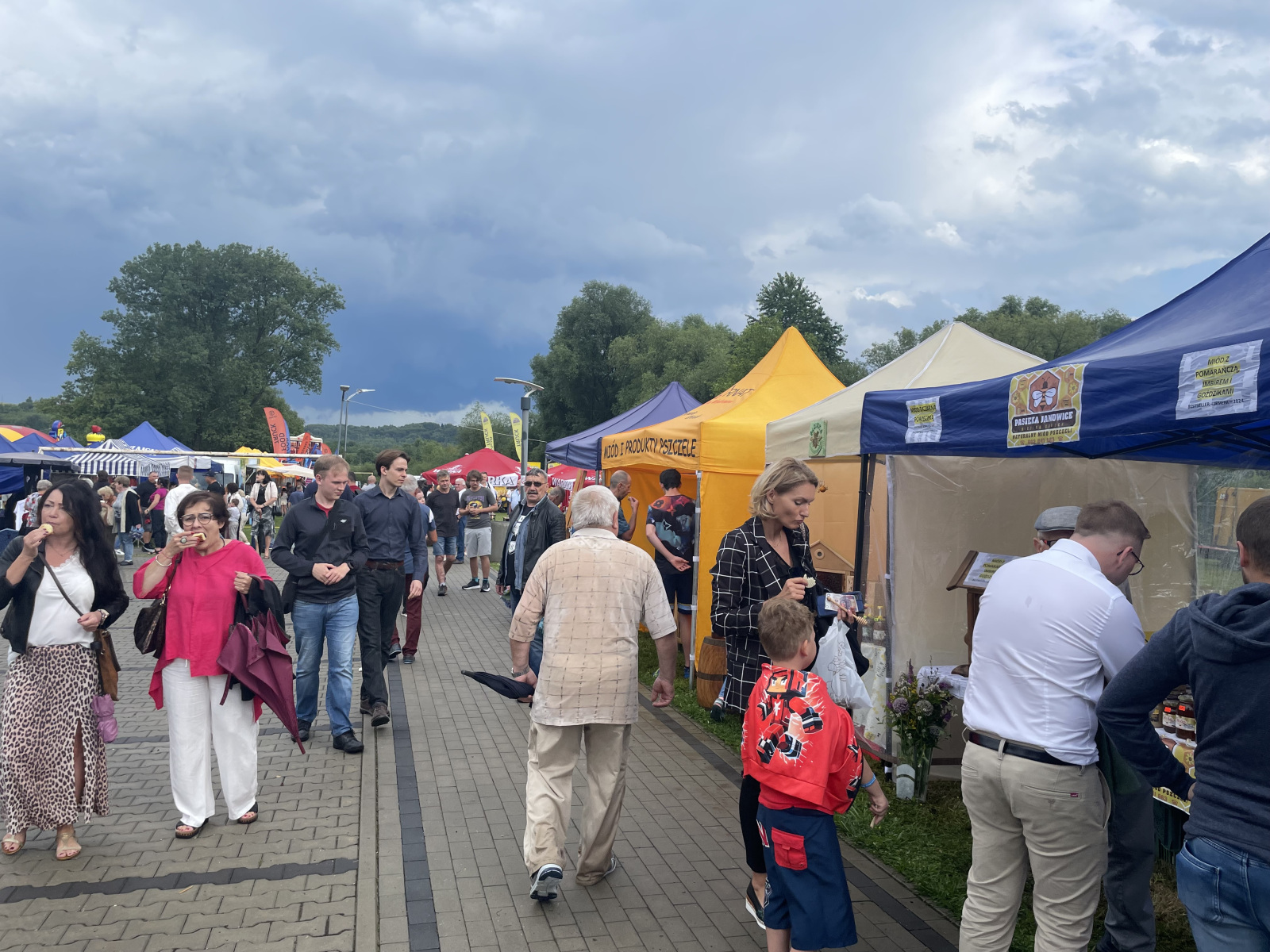 – Jest wspaniała atmosfera, tylko szkoda, że nie ma pogody. Próbowałam ciast ze Szczapanowic, kupiłam kilka wypieków z dawnych lat, skosztowałam miodu z pokrzywą. – Ciasteczka ze Świebodzina, bardzo dobre. Troszkę nas pokropiło, wyrwaliśmy się z Tarnowa, żeby regionalne produkty tu popróbować. – Troszkę zmokliśmy, ale teraz suszymy się na słoneczku, myślę, że będziemy się dobrze bawić. Pokosztować miodów, lody, są kanapki ze smalcem, pieczone ciasta rogaliki.