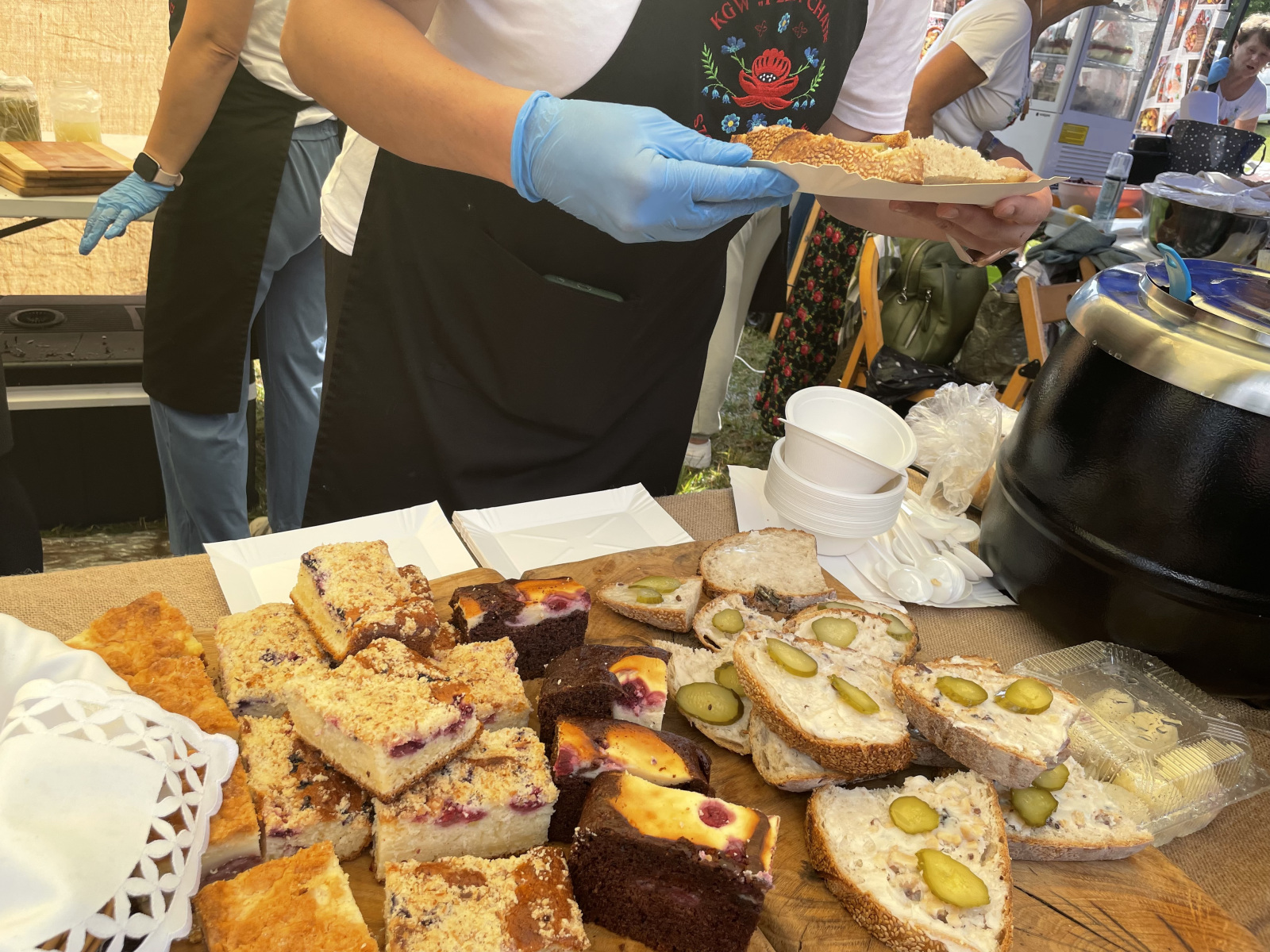 – Jest wspaniała atmosfera, tylko szkoda, że nie ma pogody. Próbowałam ciast ze Szczapanowic, kupiłam kilka wypieków z dawnych lat, skosztowałam miodu z pokrzywą. – Ciasteczka ze Świebodzina, bardzo dobre. Troszkę nas pokropiło, wyrwaliśmy się z Tarnowa, żeby regionalne produkty tu popróbować. – Troszkę zmokliśmy, ale teraz suszymy się na słoneczku, myślę, że będziemy się dobrze bawić. Pokosztować miodów, lody, są kanapki ze smalcem, pieczone ciasta rogaliki.