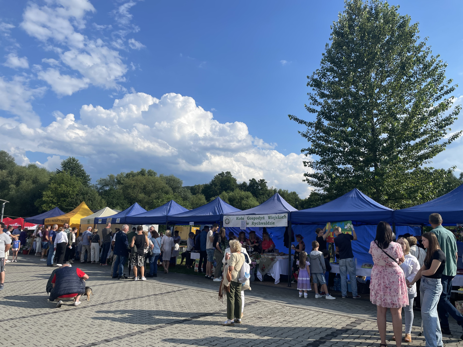 – Jest wspaniała atmosfera, tylko szkoda, że nie ma pogody. Próbowałam ciast ze Szczapanowic, kupiłam kilka wypieków z dawnych lat, skosztowałam miodu z pokrzywą. – Ciasteczka ze Świebodzina, bardzo dobre. Troszkę nas pokropiło, wyrwaliśmy się z Tarnowa, żeby regionalne produkty tu popróbować. – Troszkę zmokliśmy, ale teraz suszymy się na słoneczku, myślę, że będziemy się dobrze bawić. Pokosztować miodów, lody, są kanapki ze smalcem, pieczone ciasta rogaliki.