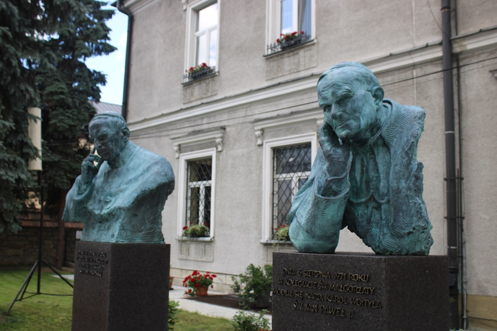 Przed wejściem do budynku plebani stoją z kolei dwa popiersia-ojca świętego Jana Pawła II i kardynała Stefana Wyszyńskiego, a przed bazyliką kamienna makieta bazyliki, która pozwala na zobaczenie świątyni z każdej perspektywy. Dodatkowo są tu oznaczenia dla osób niewidomych lub słabowidzących, które posługują się językiem Braille’a.