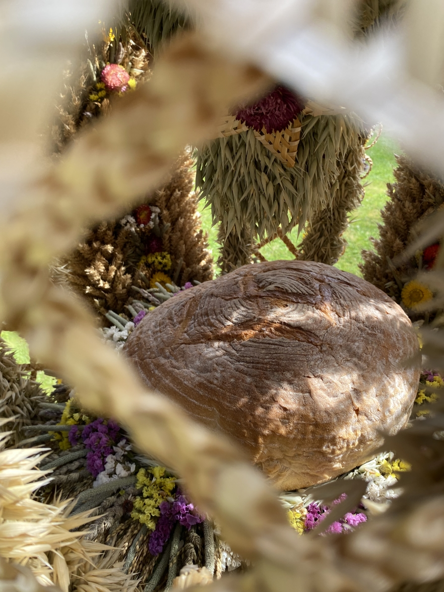 Wieniec z Łękawki powstał tradycyjną techniką z pszenicy, żyta, owsa i jęczmienia, ozdobiony suszonymi kwiatami, ziołami, warzywami i owocami.