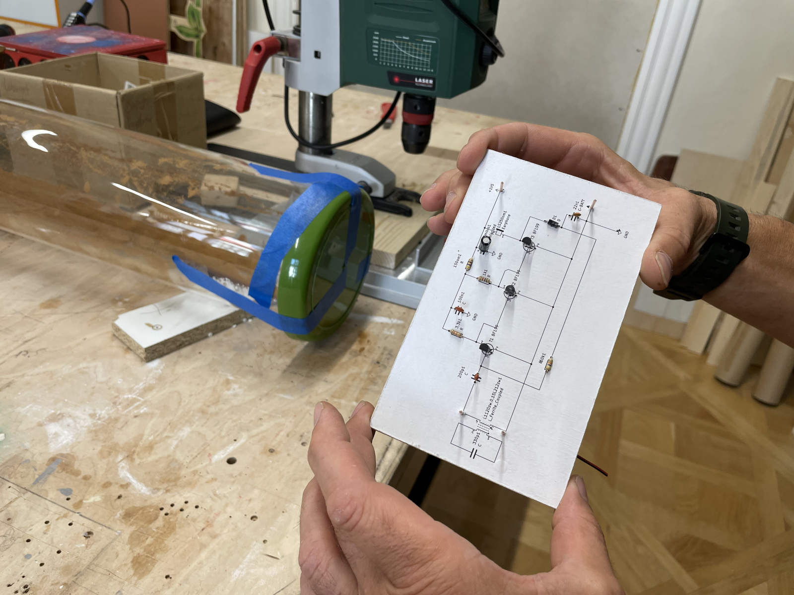 – Słyszymy różne efekty, pochodzące z różnych instrumentów, czy przedmiotów grających, jest kawałek pozytywki, jest kawałek sprężyny, są struny, jest smyczek, silniczek elektryczny, są elementy światłoczułe, które przekładamy na dźwięk, można w to pudło stukać, pociągać je, uzyskujemy naprawdę różne dźwięki. Takie instrumenty używa się do tworzenia filmów horrorów.