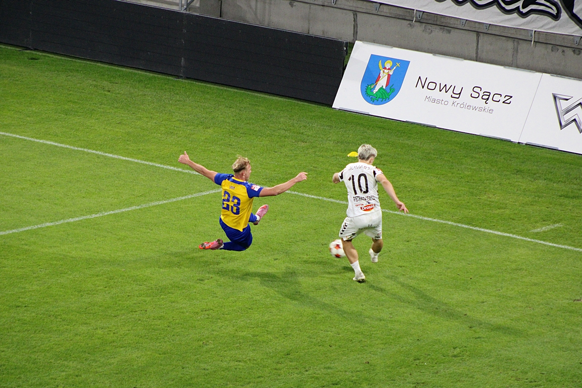 Po zmianie stron było dużo walki, co odczuł mocno Kamil Słaby. Kapitan Sandecji długo leżał na murawie po starciu z rywalem w środkowej strefie boiska, ale postanowił kontynuować grę.
