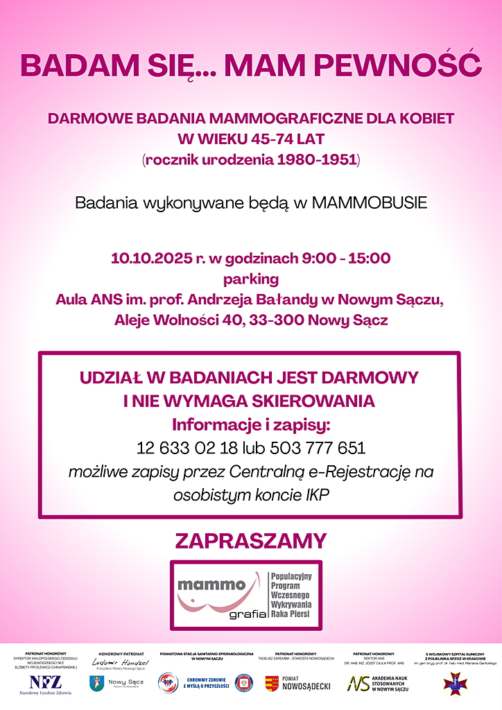 W międzyczasie, z darmowych badań mammograficznych i niewymagających skierowania, będzie można skorzystać na parkingu przed budynkiem w godzinach 9.00 – 15.00. Panie mogą zapisać się na badanie pod numerami telefonów 12 633 02 18 oraz 503 777 651.