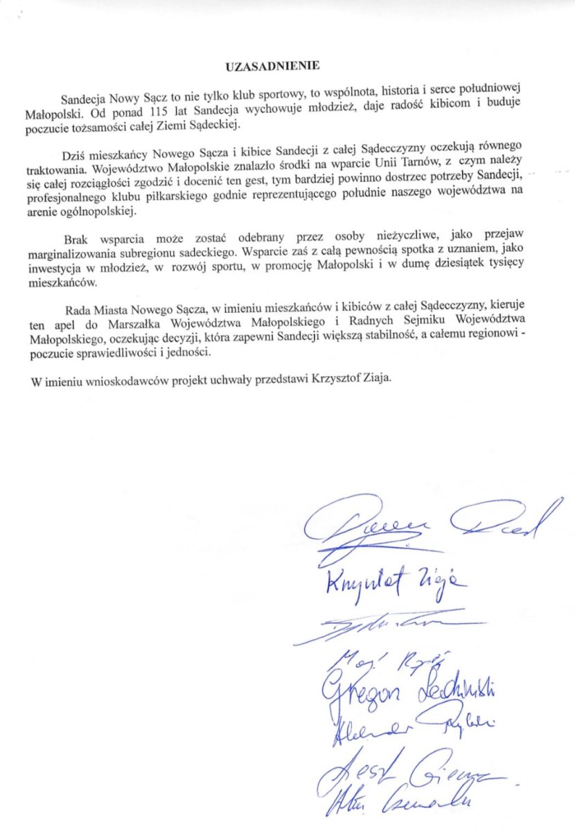 W przedłożonym projekcie uchwały wnioskodawcy, reprezentując mieszkańców i kibiców z całej Sądecczyzny, kierują apel do Marszałka Województwa Małopolskiego oraz Radnych Sejmiku Województwa Małopolskiego, oczekując decyzji, która zapewni Sandecji stabilność finansową, a całemu regionowi poczucie sprawiedliwości i jedności.