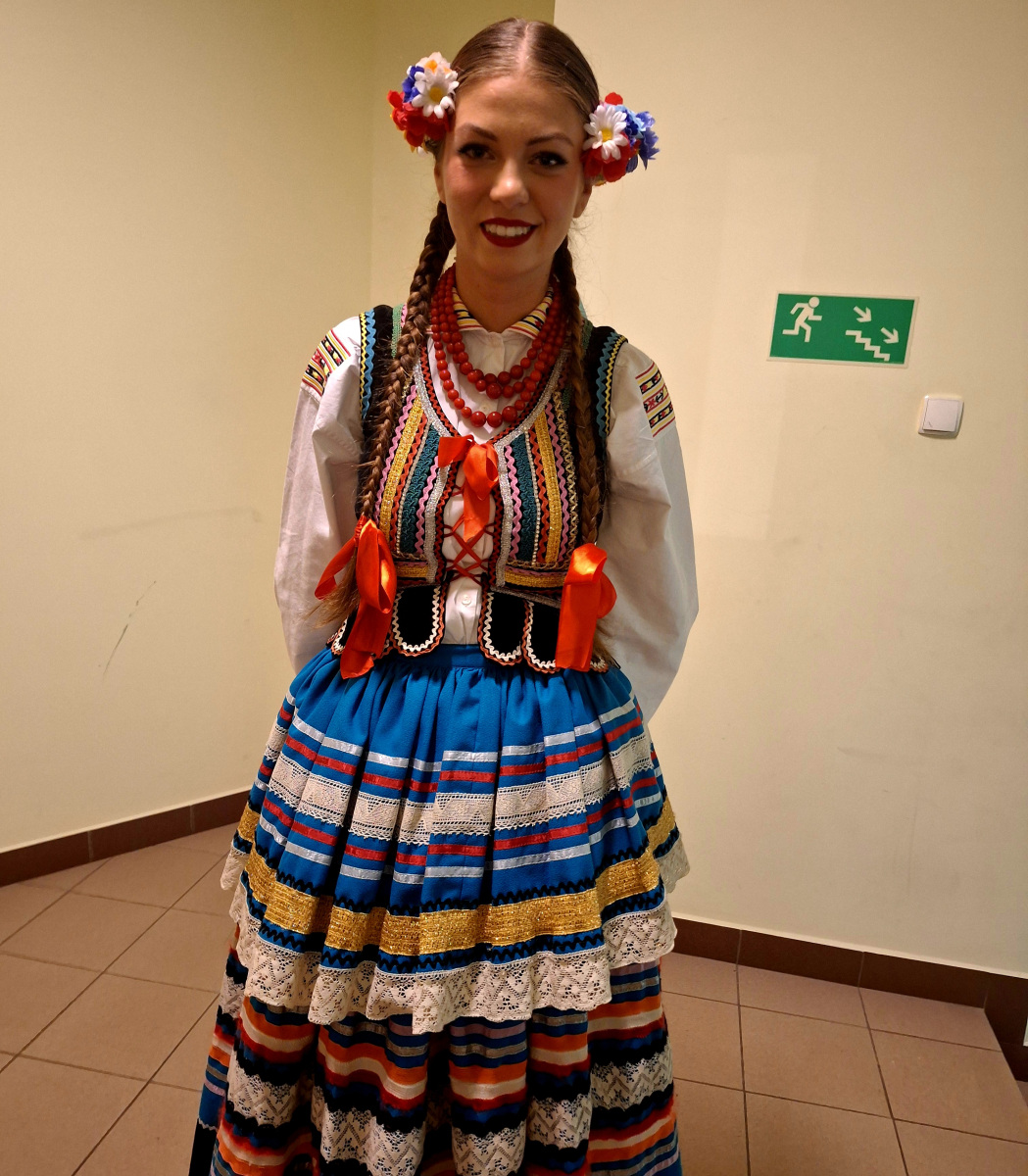 – Ja mam na sobie strój lubelski. Składa się on ze spódnicy i gorsetu. Wianek wygląda tu troszeczkę inaczej, bo jest przypięty od tyłu. Charakterystyczne są również korale, dwa warkocze, buty i białe rajstopy – dodaje Aleksandra Więcek.