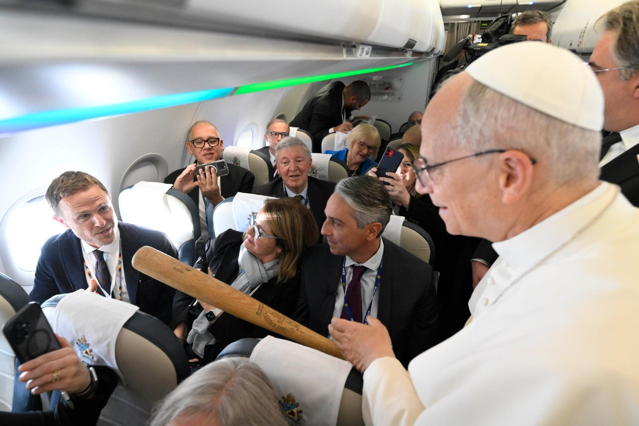Zgodnie z tradycją zapoczątkowaną przez papieża Franciszka, Leon XIV witał wszystkich dziennikarzy z osobna, zatrzymując się przy wszystkich siedzeniach, błogosławiąc, żartując, rozmawiając, robiąc selfie. A dziennikarze wręczali mu prezenty.