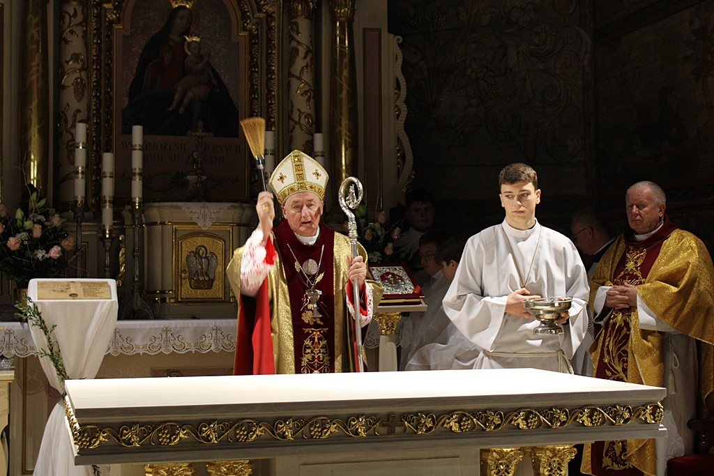 Ordynariusz Diecezji Tarnowskiej namaścił i okadził ołtarz oraz umieścił w jego wnęce relikwie św. Klemensa.  Biskup Andrzej Jeż podkreślił rolę ołtarza, który jest centralnym punktem świątyni, jako miejsca, gdzie realizuje się Najświętsza Ofiara Chrystusa. Jak dodał, ołtarza powinien promieniować z Domu Bożego do naszych rodzinnych domów, bo przy nim zaczęła się historia naszego życia.