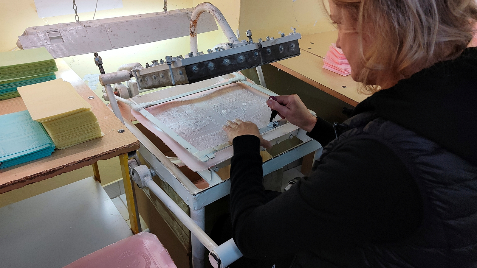 -Trzymam w ręku specjalną polewaczkę, która ma takie cztery lejki, równo rozprowadzone. Leję ciasto na piec i szybko zamykam. Pieczemy około dwóch minut. Praca do lekkich nie należy, ale też nie do najcięższych. Przez ręce dziennie przechodzi około 50 kop takich płacht z opłatkami. To ponad 3000 dziennie.