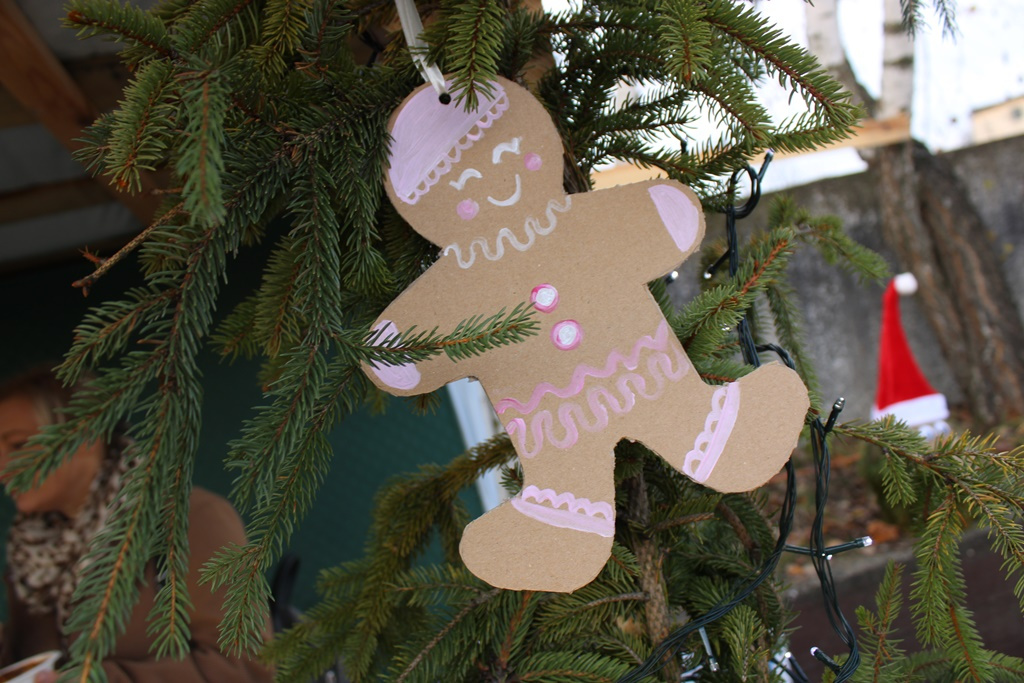 Na terenie przy placówce stoi drewniana wiata, którą wyścielono siankiem i udekorowano w bożonarodzeniowe ornamenty.
