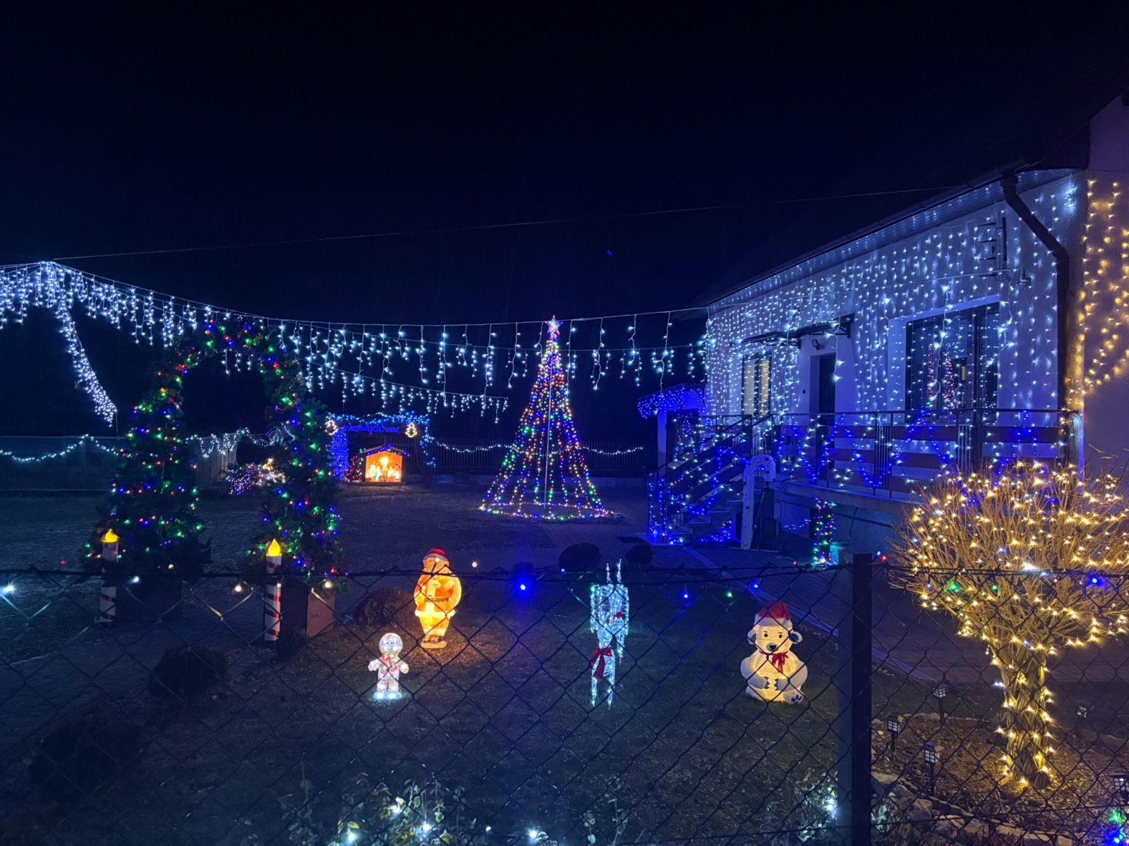 Na sąsiadujących ze sobą posesjach można znaleźć szerokie kurtyny świetlne, bramy, liczne figury oraz świecącą po zmroku szopkę bożonarodzeniową. Jak mówi 16-latek, podświetlana szopka to najważniejszy element całej instalacji.