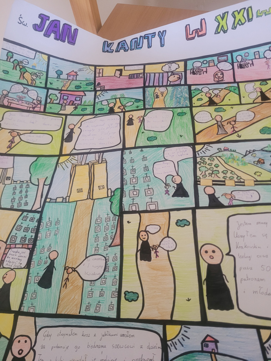 – Był nauczycielem na Uniwersytecie Krakowskim i był też księdzem, był też bardzo dobrym człowiekiem, pomagał potrzebującym. Był życzliwym, honorowym człowiekiem, zawsze dotrzymywał słowa. Nasze prace były w formie komiksu. W kilku scenach pokazywaliśmy np. szkołę, jakiś budynek, gdzie przychodził do nas św. Jan Kanty i pomagał nam z różnymi rzeczami –