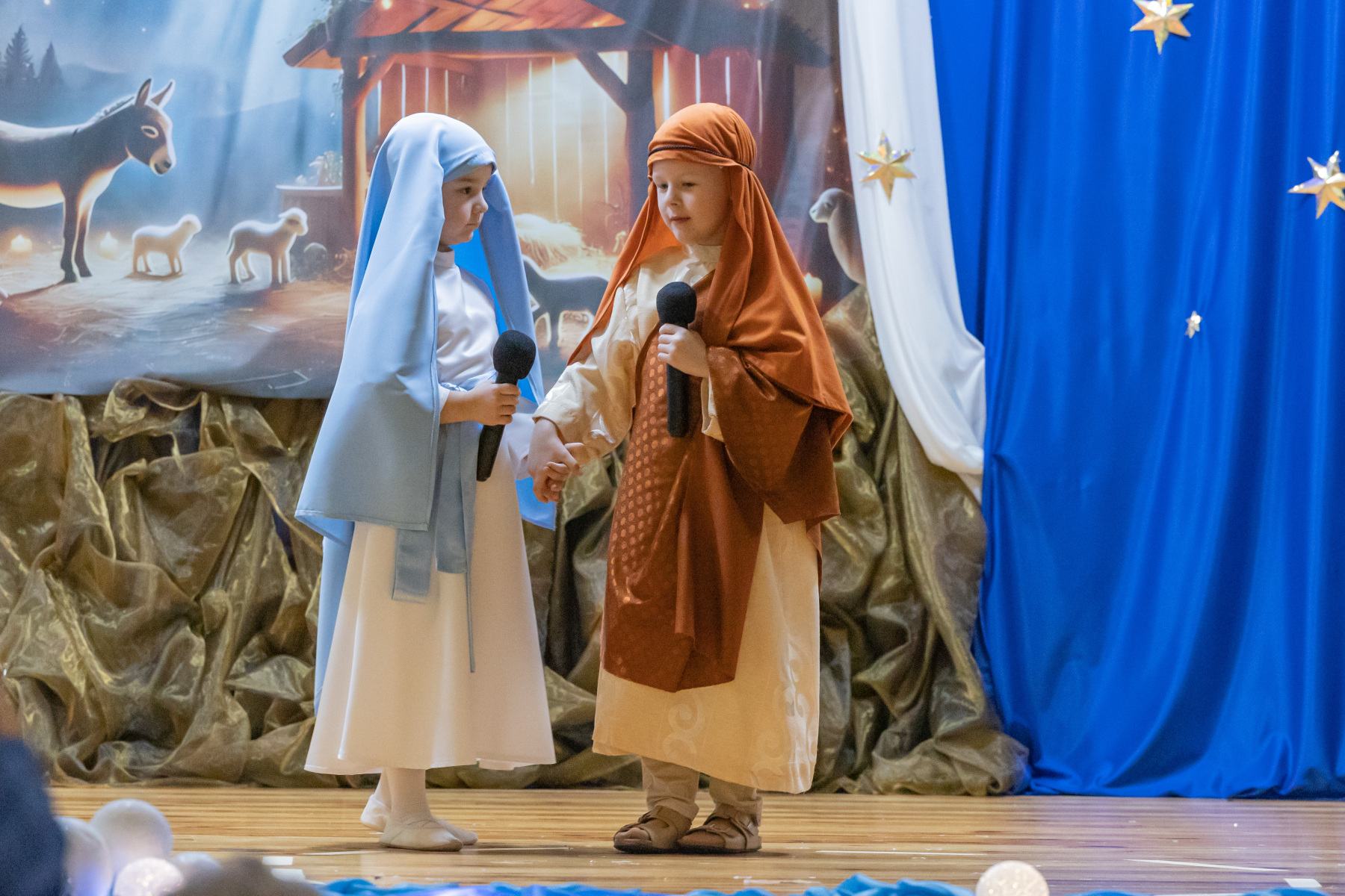 Na scenie zobaczyć można było opowiadające biblijną historię postaci Dzieciątka Jezus, Maryi czy Józefa, ale też grupy aniołków i pastuszków wykonujących barwne choreografie.