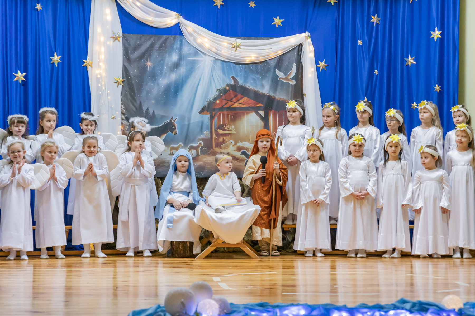 Na scenie zobaczyć można było opowiadające biblijną historię postaci Dzieciątka Jezus, Maryi czy Józefa, ale też grupy aniołków i pastuszków wykonujących barwne choreografie.