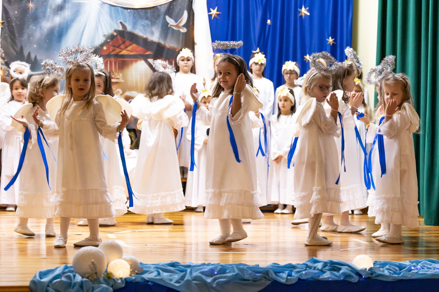 Na scenie zobaczyć można było opowiadające biblijną historię postaci Dzieciątka Jezus, Maryi czy Józefa, ale też grupy aniołków i pastuszków wykonujących barwne choreografie.